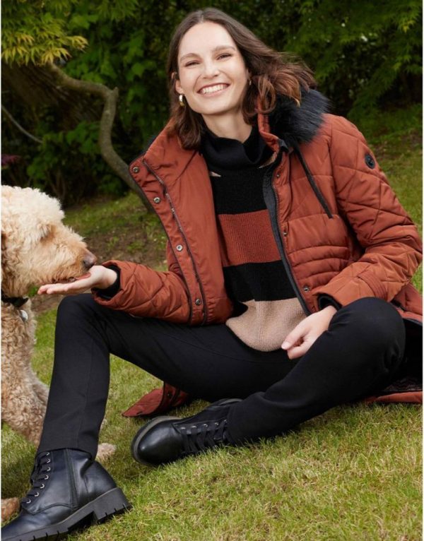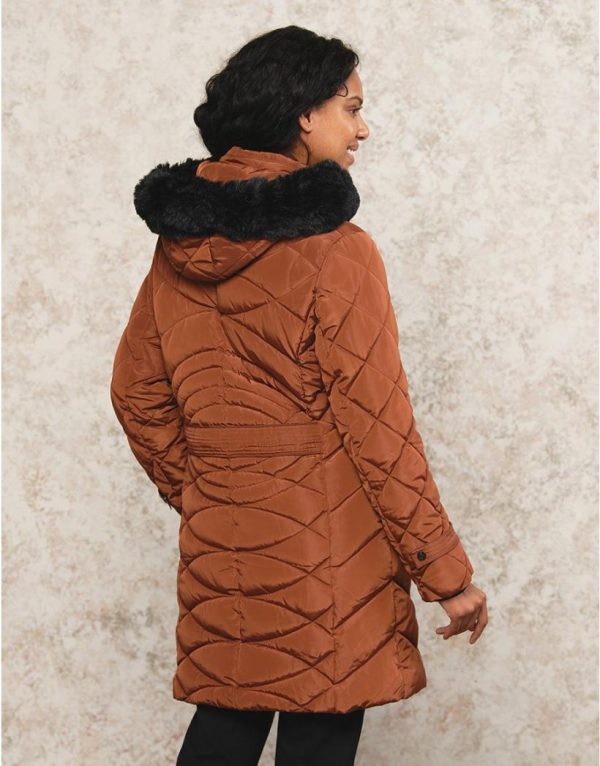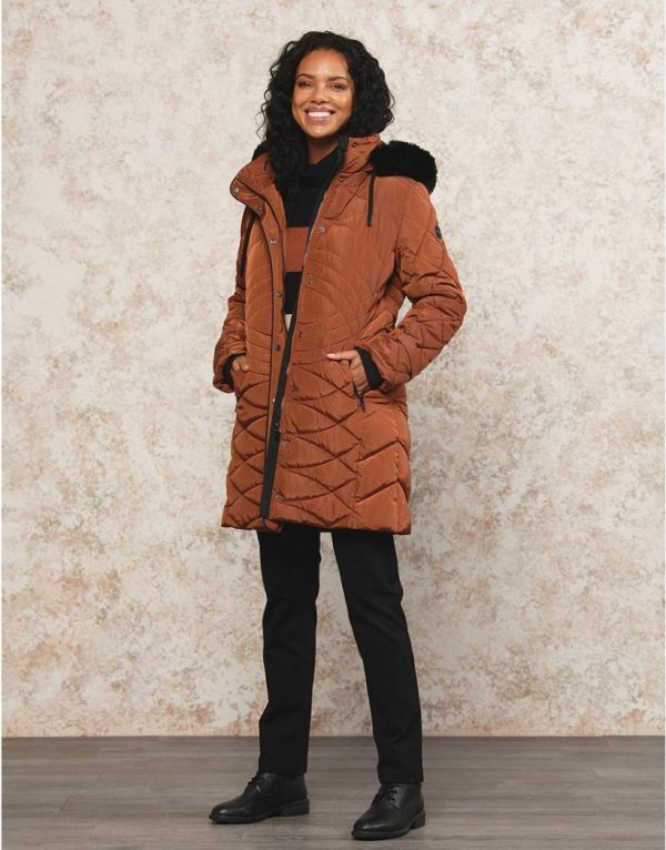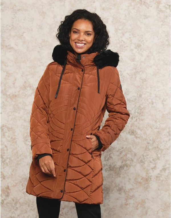 – Une belle longueur sous le genou, un coloris chaud et lumineux, un jeu de matelassage qui met en valeur la taille, capuche et fourrure amovibles.