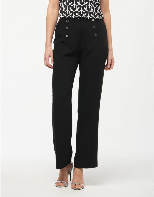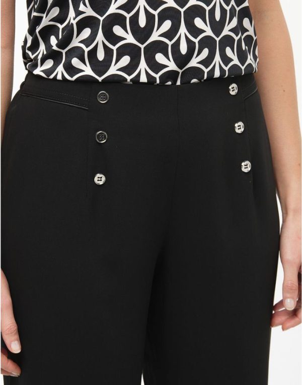 Envie de changer de vos éternels slims ? Voici le modèle qu’il vous faut, avec des jambes larges, et la fantaisie chic du boutonnage façon « pont » sur le devant, agrémenté sur les côtés par des empiècements soulignés d’un liseré noir. Le dos reste élastiqué pour le confort. Un pantalon très réussi pour des looks masculin/féminin très trendy.