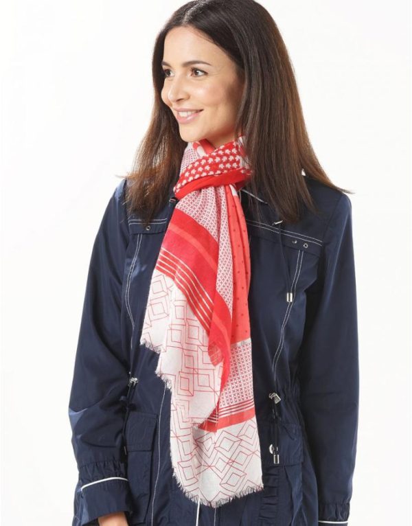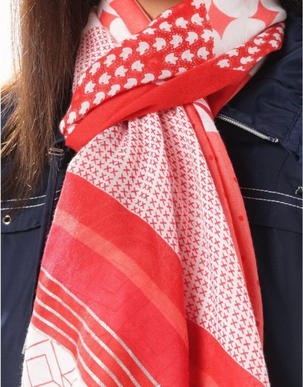 Le rouge, le rose et l’écru se rencontrent dans ce foulard imprimé graphique. Idéal pour toutes les occasions.