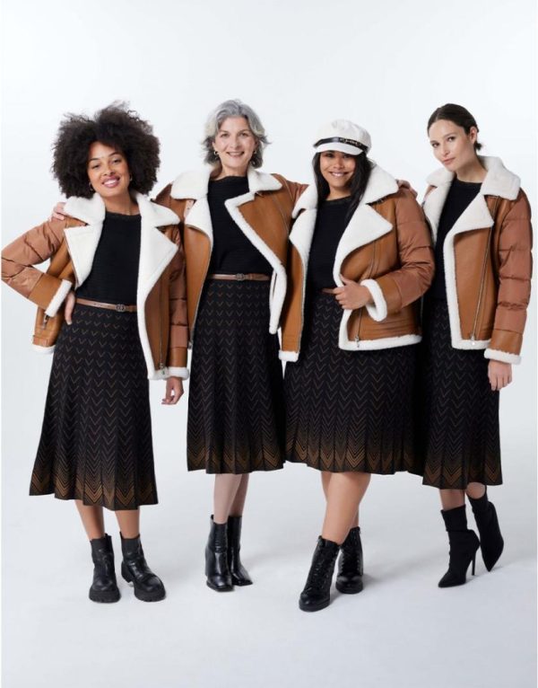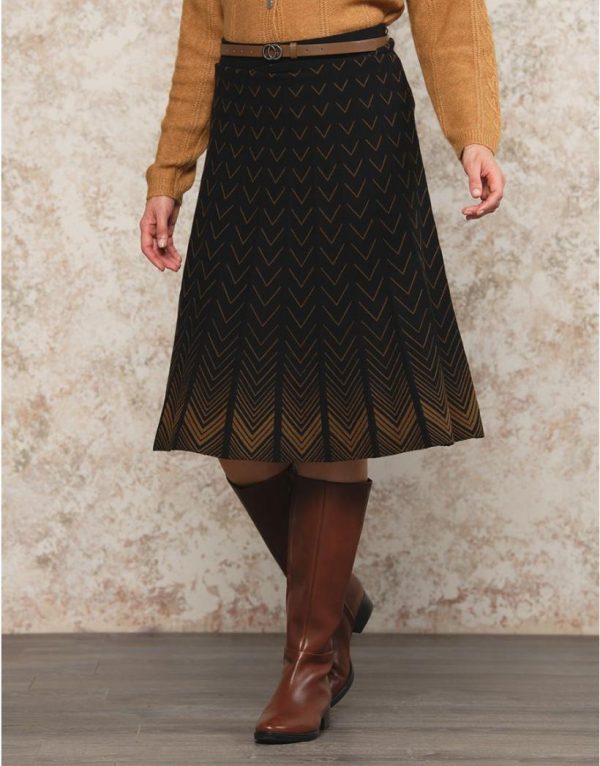 – Une longueur midi tendance, une maille au tombé impeccable, un motif chevron moderne, un mix couleur noir/camel facile à assortir