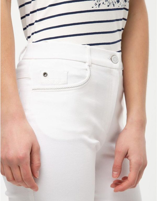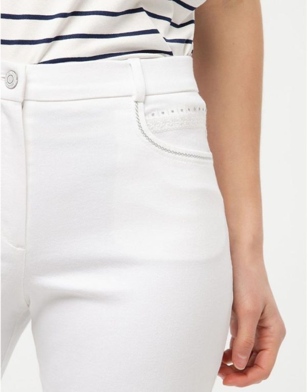 Plus incontournable qu’un jean blanc quand le printemps est là, cela n’existe pas ! C’est dire si notre modèle de jean va vite devenir indispensable surtout quand vous verrez ses jolis détails : poches avant soulignées de broderies argentées et détails façon broderie anglaise. La coupe est ajustée, avec un empiècement en V au dos et des jambes raccourcies façon 7/8.