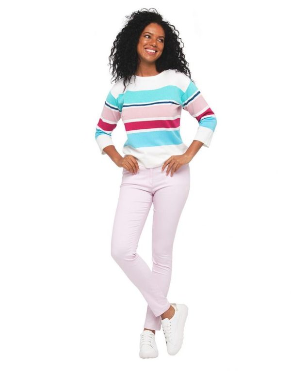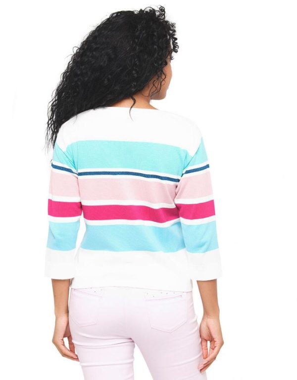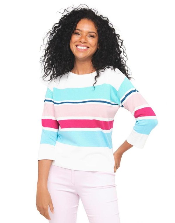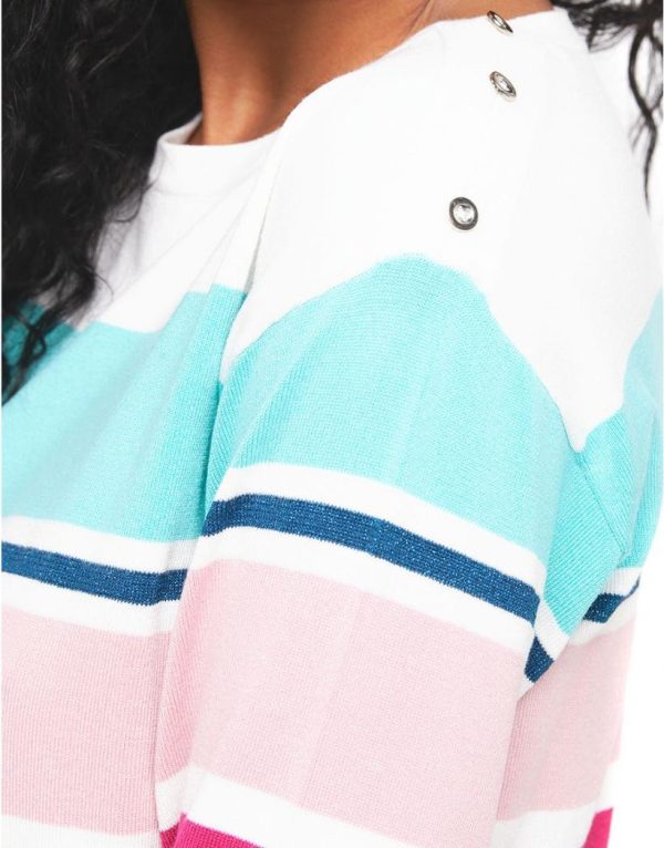– Pull écru rayures multicolore bleu et rose