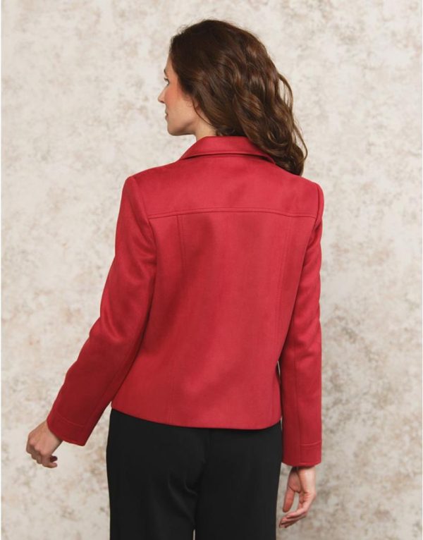 – Tendance, le coloris rouge éteint se décline avec élégance sur une veste façon suédine facile à porter. Les œillets métalliques apportent de la brillance. Associée aussi bien à du noir, du marine ou du jean, cette veste saura trouver sa place dans de très nombreux looks.
